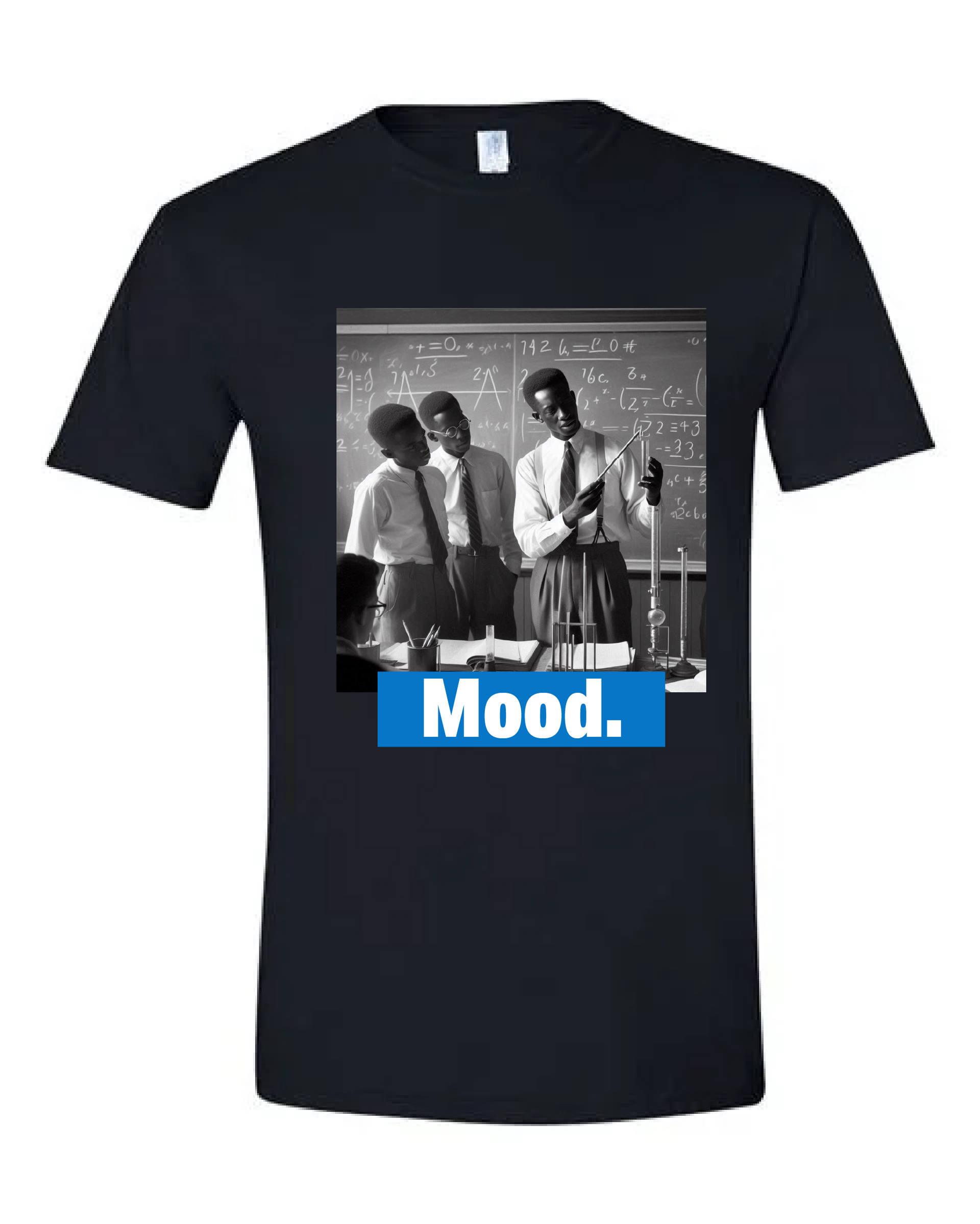 Step into your power with the "Mood" tee — featuring a bold image of Black men confidently engaging in STEM in a classroom setting. This empowering design captures intelligence, focus, and brotherhood, all framed by the word “mood” in bold white font and vibrant blue background. Perfect for educators, students, and math lovers who know the grind and the glory.